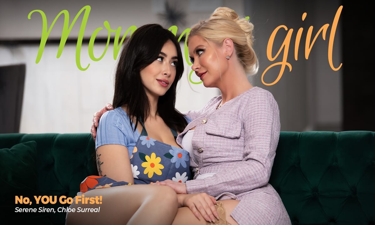 Serene Siren returns home from work, and is pleasantly surprised at the sight of her stepdaughter Chloe Surreal making dinner in the kitchen. Serene loosens up her work clothes so she can relax and then gets behind Chloe, affectionately guiding Chloe's hands to correct her vegetable chopping technique.